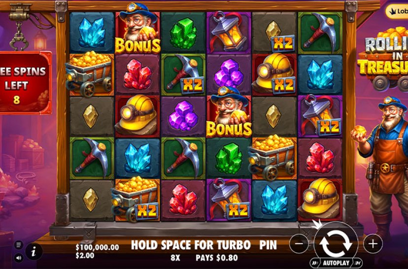 Dig for gold in Rolling in Treasures, where matching eight or more mining symbols reveals instant cash rewards. Random multipliers can appear during tumbles, starting at 2x and increasing with each cascade. Land 4–6 miner Bonus symbols to unlock 10–20 Free Spins with escalating multiplier potential throughout the round.